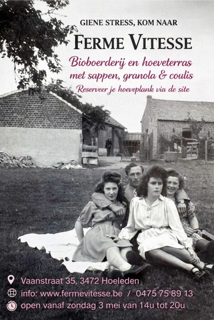 Om de oude familieboerderij nieuw leven in te blazen, volgde Karolien Taverniers de biolandbouwopleiding van Landwijzer vzw. Na een 25-jarige carrière als reporter voor de VRT in Brussel koos ze resoluut voor een leven als boerin op het platteland. Vitesse was de bijnaam van haar bompa — Ferme Vitesse is een ode aan hem, de leukste bompa op aarde.